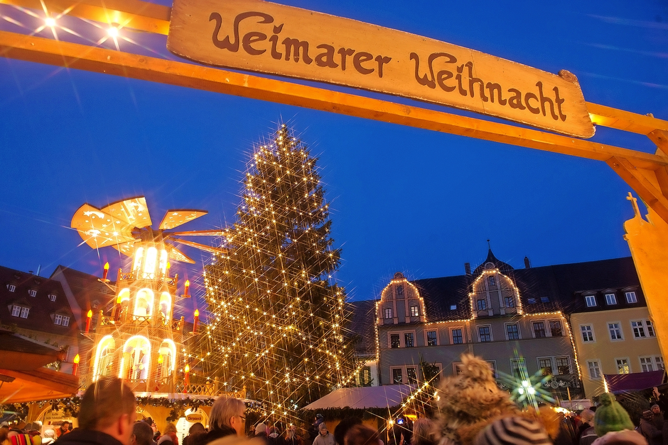 Im Herzen der Stadt, auf dem Marktplatz, erstrahlt eine prächtige Edeltanne im festlichen Lichterglanz. Sie erinnert an eine besondere Tradition: 1815 wurde in Weimar der erste öffentliche Weihnachtsbaum Deutschlands aufgestellt. Der großzügige Buchhändler Hoffmann ließ seinen geschmückten Baum aus der guten Stube auf den Marktplatz bringen – zur Freude aller Kinder, ob arm oder reich. Von hier aus verbreitete sich dieser schöne Brauch weit über die Stadtgrenzen hinaus.